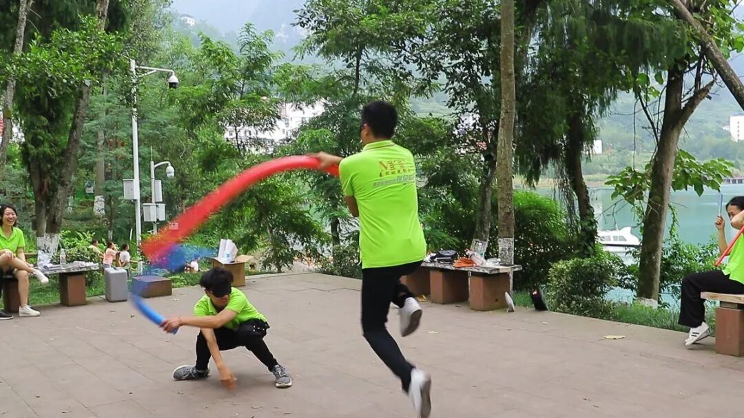 此游戏考验团队协作能力,每人用手掌心控制一根不倒森林并且在规定的时间内进行转圈轮换,最后接力成功圈数最多的小组获胜。