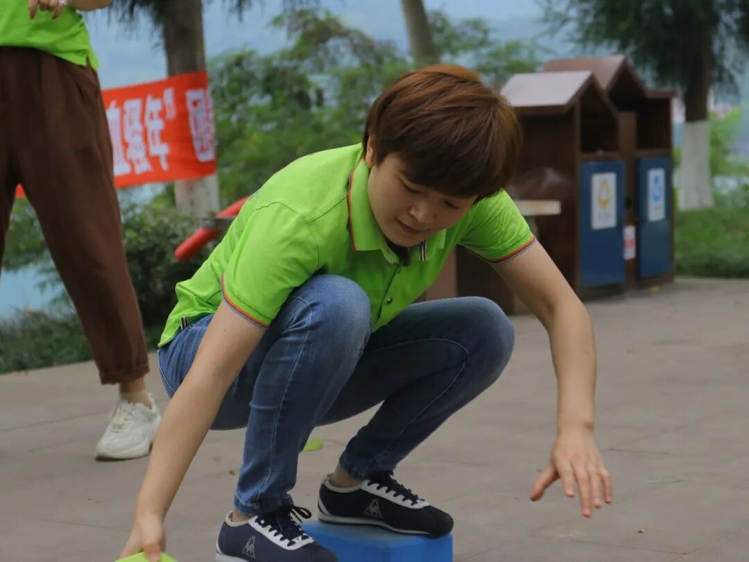 摸石过河游戏也是考验身体协调力和平衡性,每组各派一名队员同时出发,每人三块砖,平铺在地上,站到前两块砖上,拿最后一块砖放在前面,交替移动,手脚不能触碰地面,如触地犯规,从起点重新开始,用时较短组获胜。